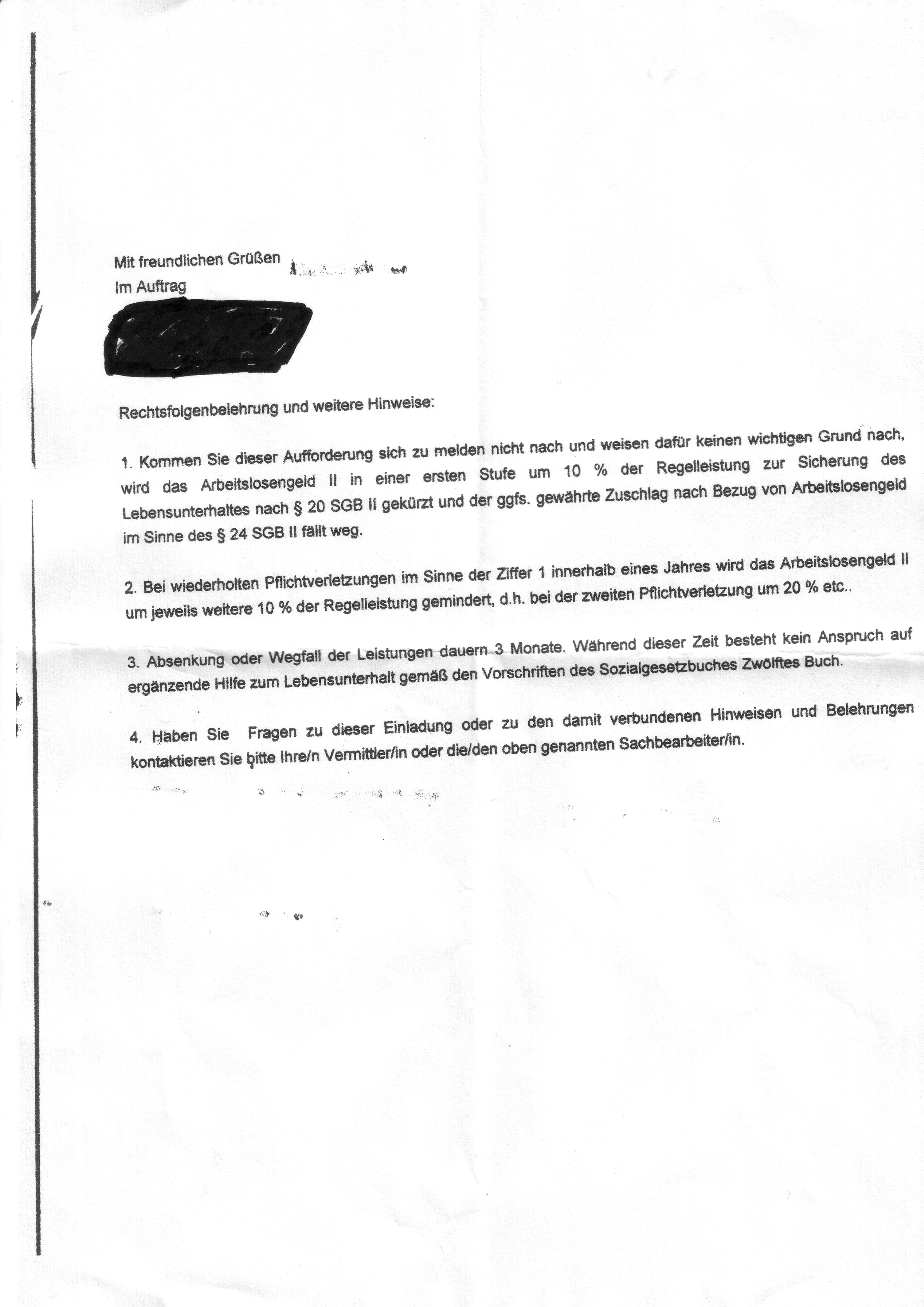 Erst im Fall einer Verweigerung sollte der Fallmanager aktiv beim Verweigerer anrufen. In diesem Rahmen ist es noch immer möglich, gegebenenfalls die Rechtskeule auszupacken. Durch dies Vorgehen würde das Amt vielen Betroffene Mut machen und deren Eigeninitiative fördern. Mit dem vorliegenden Brief zerstört das Amt für Beschäftigungsförderung sehr subtil das Softskill "Selbstwertgefühl". So werden arbeitslose demotiviert und vom Amt in den "Dreck gestoßen". Die Rückkehr in den Arbeitsmarkt wird zusätzlich erschwert.